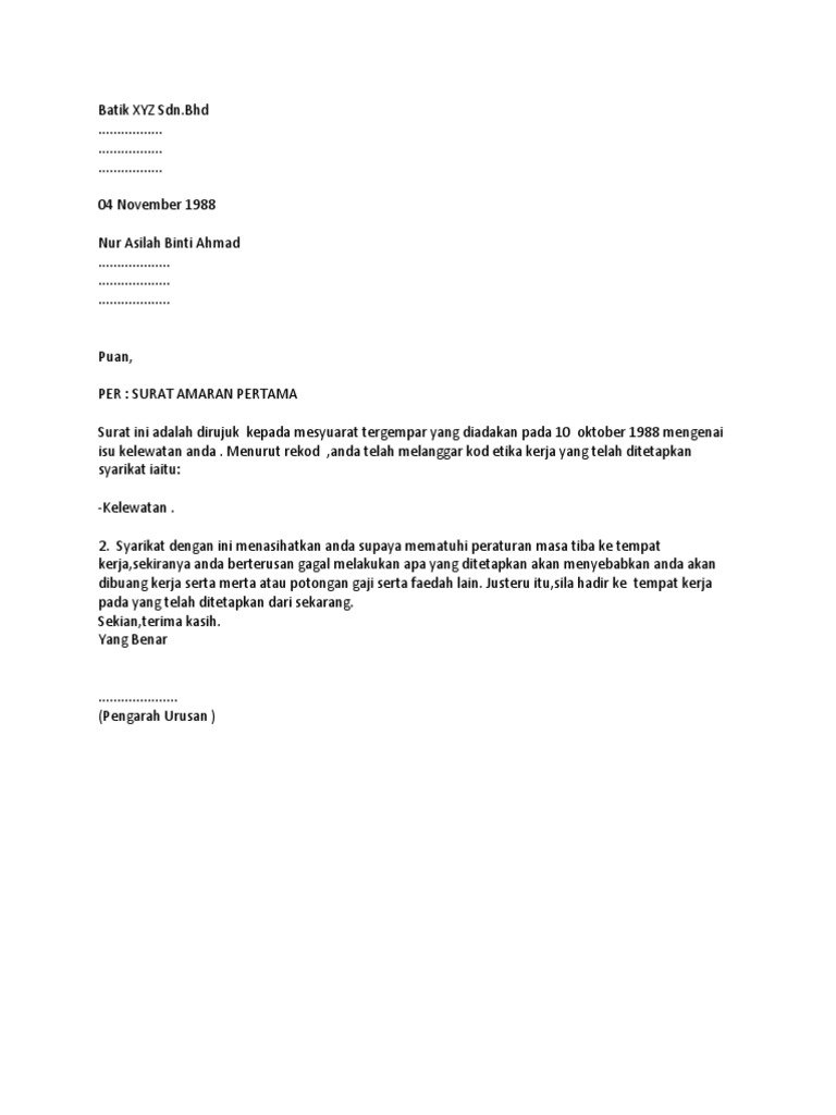 SURAT AMARAN PERTAMA Surat ini adalah dirujuk kepada mesyuarat tergempar yang diadakan pada 10 oktober 1988 mengenai isu kelewatan anda. Makmal swasta yang telah mendapat akreditasi isoiec 17025 di bawah skim. 15 contoh surat amaran tatatertib.